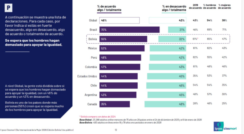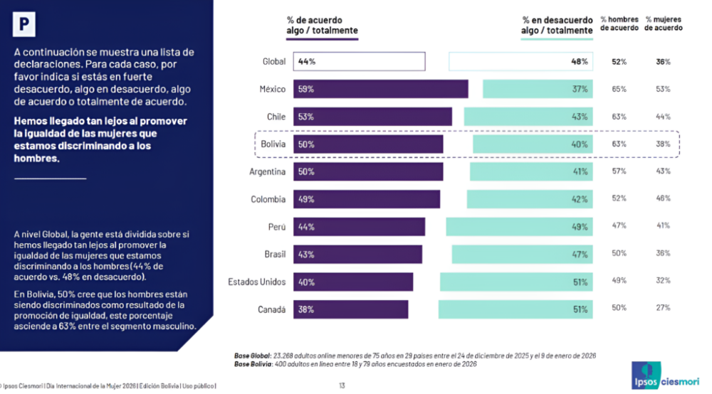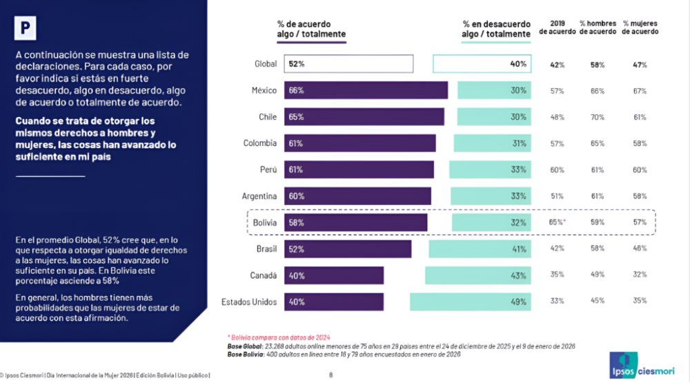 Según la información recolectada en enero de 2026, Bolivia supera el promedio global en la creencia de que ya se ha avanzado lo suficiente en materia de igualdad de derechos, con un 58% de acuerdo frente al 52% del resto del mundo.