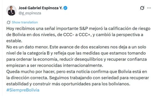 ”No es un dato menor. Este avance de dos escalones nos deja a un solo nivel de la categoría B y refleja que las medidas que estamos tomando para ordenar la economía, reducir desequilibrios y recuperar confianza empiezan a ser reconocidas internacionalmente”, escribió el ministro de Economía, José Gabriel Espinoza.