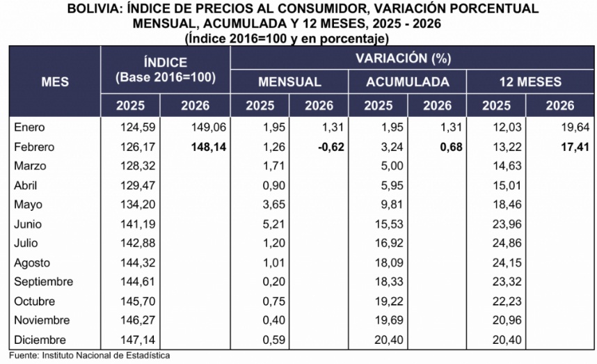 Bolivia prevé cerrar este 2026 con una inflación de entre un 12% y hasta 17%, según proyecciones del Banco Central de Bolivia (BCB) y del Ministerio de Economía y Finanzas Públicas, reveló este jueves el director del Instituto Nacional de Estadística (INE), Jorge Akamine.