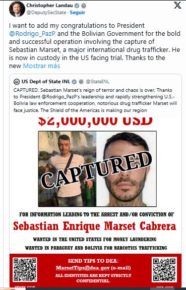 La autoridad estadounidense también felicitó el trabajo del presidente Rodrigo Paz y su gobierno y calificó de “audaz y exitosa” la operación con la que se logró la captura de “Sebastián Marset, un importante narcotraficante internacional”.