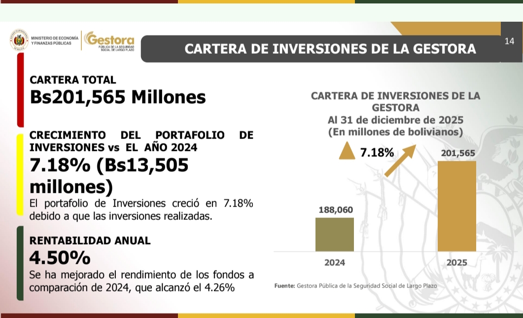 Al cierre de 2025, la cartera del Fondo de Pensiones, administrado por la Gestora, llegó al pico de Bs 201.565 millones, que significa un incremento del 7,18% respecto a la gestión 2024 que era de Bs 188.060 millones.