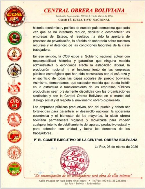 La Central Obrera Boliviana (COB) rechazó este viernes cualquier intento de reducir personal en las empresas públicas productivas, pese a que, durante el gobierno del Movimiento al Socialismo (MAS), se viene informando que varias de estas entidades presentan déficits o incluso han sido calificadas como «elefantes blancos». Mediante un pronunciamiento difundido en esta jornada, la organización sindical expresó su «profunda preocupación y firme rechazo» ante la posibilidad de aplicar recortes en la masa salarial y en el presupuesto de las empresas públicas, en el marco de medidas de racionalización del gasto estatal.