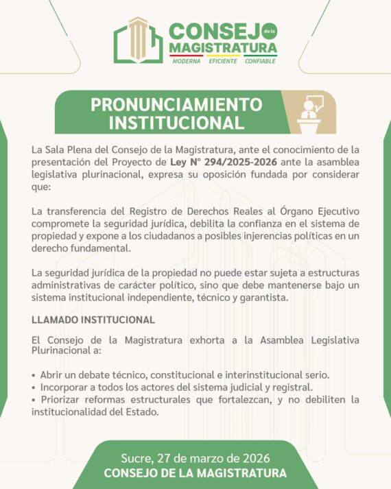 La Sala Plena del Consejo de la Magistratura expresó su oposición fundada al Proyecto de Ley presentado ante la Asamblea Legislativa Plurinacional, que propone la transferencia del Registro de Derechos Reales al Órgano Ejecutivo, específicamente al Ministerio de la Presidencia. En un pronunciamiento institucional emitido ayer desde Sucre, la entidad encargada de la administración del sistema judicial advirtió que la iniciativa compromete la seguridad jurídica, debilita la confianza en el sistema de propiedad y expone a los ciudadanos a posibles injerencias políticas en un derecho fundamental.