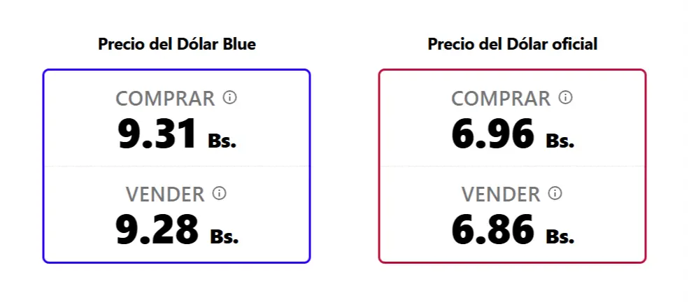 Por su parte, el portal bolivianblue.net, que actualiza sus datos cada 15 minutos, también registra cifras similares: Bs 9,31 para la compra y Bs 9,28 para la venta.