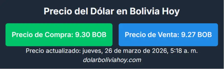 De acuerdo con el portal dolarboliviahoy.com, la cotización se ubica en Bs 9,30 para la compra y Bs 9,27 para la venta, lo que representa un ajuste respecto a la jornada previa.