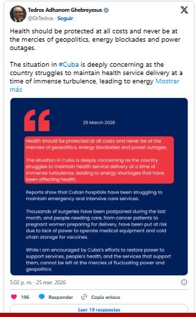 Además, el director general de la Organización Mundial de la Salud (OMS) declaró este 25 de marzo que la situación sanitaria en Cuba era «profundamente preocupante». «La salud debe protegerse a toda costa y nunca estar a la merced de la geopolítica, los bloqueos energéticos y los cortes de electricidad», subrayó en X Tedros Adhanom Ghebreyesus.