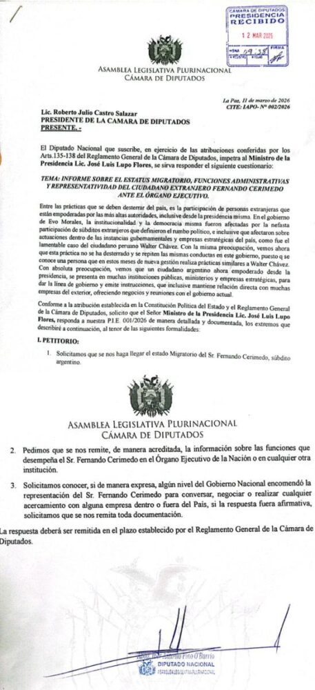 La solicitud fue presentada el 11 de marzo y, según el legislador, ya fue remitida al Ejecutivo. Pino espera que, en el plazo establecido de 15 días, se brinde una respuesta oficial que permita esclarecer la participación de personas extranjeras en espacios de decisión del Gobierno, una práctica que, según afirmó, debería ser erradicada.