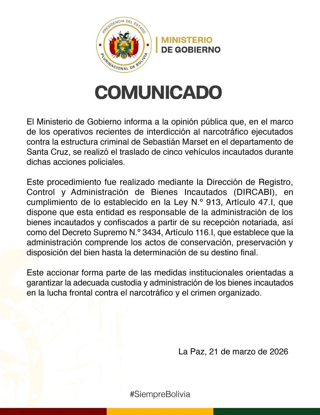 “El Ministerio de Gobierno informa a la opinión pública que, en el marco de los operativos recientes de interdicción al narcotráfico ejecutados contra la estructura criminal de Sebastián Marset en el departamento de Santa Cruz, se realizó el traslado de cinco vehículos incautados durante dichas acciones policiales”, refiere un comunicado de esa cartera de Estado.