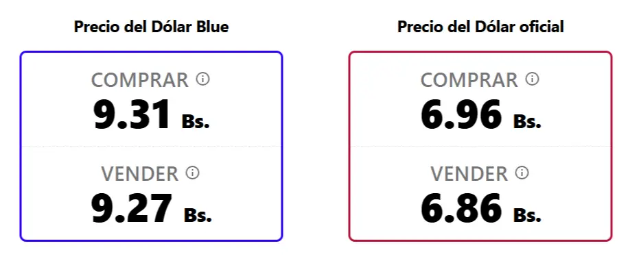 Por su parte, el portal bolivianblue.net, que actualiza sus datos cada 15 minutos, señala que el dólar paralelo alcanza Bs 9,31 para la compra y Bs 9,27 para la venta.