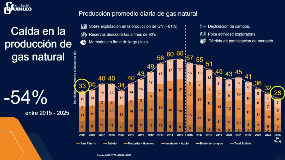 – Caída en la producción de gas en -54% entre 2015-2025 por falta de exploración, pérdida de mercados y corrupción.