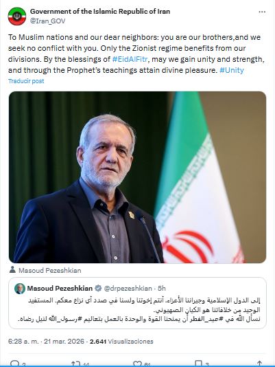 «No buscamos entrar en conflicto con ustedes», afirmó Pezeshkian en un mensaje en inglés en la red social X, en el día 22 de la guerra, durante la que la República Islámica no ha cesado sus ataques contra bases y objetivos estadounidenses en la región de Oriente Medio. En su mensaje con ocasión del Aid al Fitr, festividad musulmana que marca el fin del mes sagrado del Ramadán, el mandatario iraní llamó a la unidad de los países islámicos y sostuvo que sólo Israel «se beneficia de nuestras divisiones».