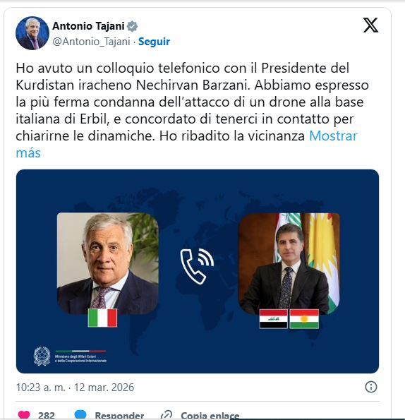 Italia mantiene soldados en Erbil en el marco de una fuerza internacional de entrenamiento de las fuerzas de seguridad del Kurdistán. Tajani indicó que la base italiana forma parte de un complejo que alberga instalaciones de otros países, “sobre todo estadounidenses”, y admitió que aún no está claro si el ataque estaba dirigido específicamente a los italianos o al complejo en general. El canciller dijo haber hablado con el presidente regional kurdo Nechirvan Barzani y subrayó que es “esencial ejercer prudencia y contención para evitar una mayor escalada”.