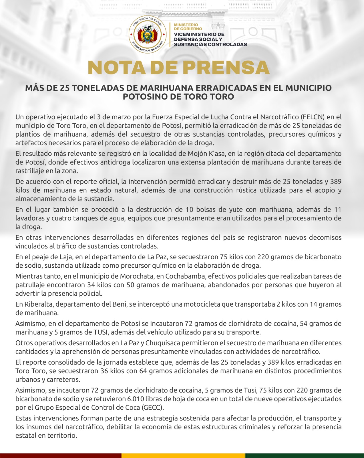 Un operativo ejecutado el 3 de marzo por la Fuerza Especial de Lucha Contra el Narcotráfico (FELCN) en el municipio de Toro Toro, en el departamento de Potosí, permitió la erradicación de más de 25 toneladas de plantíos de marihuana, además del secuestro de otras sustancias controladas, precursores químicos y artefactos necesarios para el proceso de elaboración de la droga.