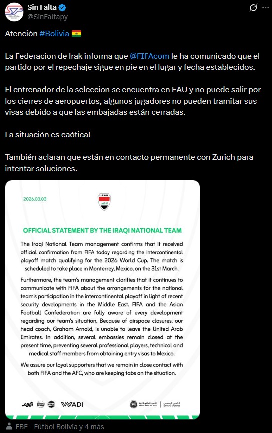 Este miércoles la FIFA confirmó a Irak como uno de los seis participantes de la repesca internacional, pese a los conflictos bélicos en Medio Oriente, situación que puso en duda la presencia de Irán en la fase de grupos y que tenía a la Federación iraquí expectante de una posible clasificación directa para ocupar esa plaza.