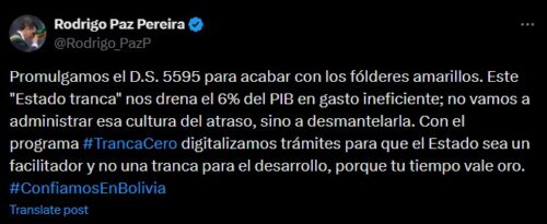 «Promulgamos el Decreto Supremo 5595 para acabar con los fólderes amarillos. Este ‘Estado tranca’ nos drena el 6% del Producto Interno Bruto en gasto ineficiente; no vamos a administrar esa cultura del atraso, sino a desmantelarla», afirmó el Jefe de Estado, en su cuenta de X.