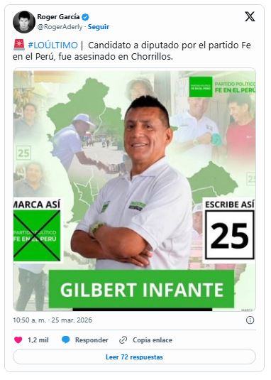 El candidato a la Cámara de Diputados del Perú, Gilbert Infante, fue asesinado en el distrito de Chorrillos, en el departamento de Lima, informó este miércoles Álvaro Paz de la Barra, postulante presidencial de Fe en el Perú, el partido del occiso.