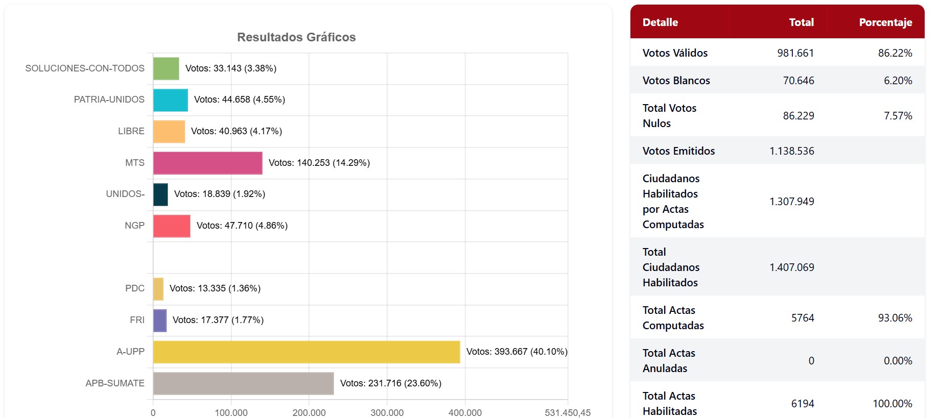 Con el 93,05% de actas computadas, Leonardo Loza, candidato de Alianza Unidos por los Pueblos (A-UPP), alcanza el 40,05% de los votos válidos y mantiene una ventaja de 16,41 puntos sobre el segundo lugar, en un escenario que, desde el análisis matemático y estadístico, descarta una caída por debajo del umbral requerido para ganar en primera vuelta.