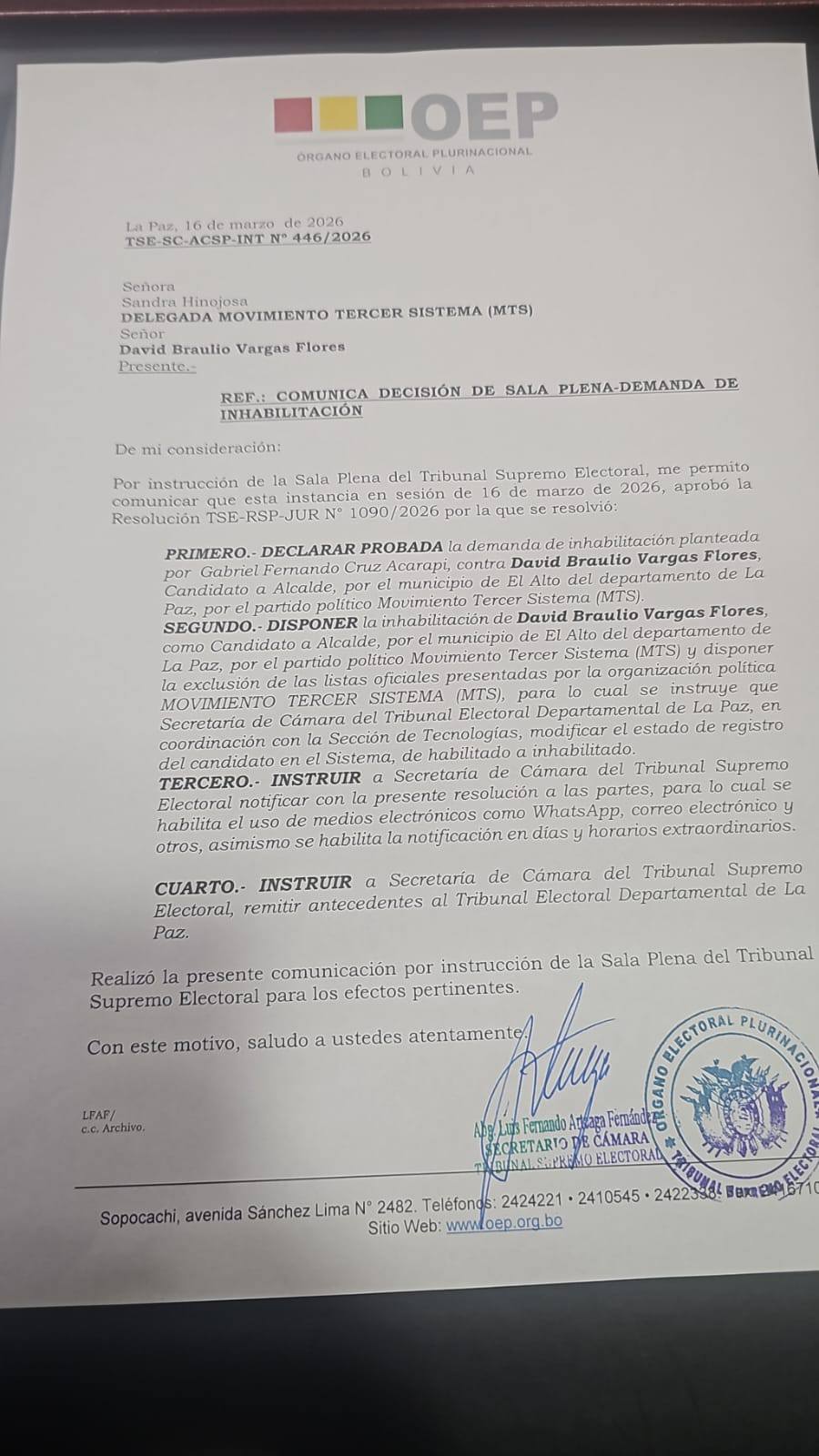En el documento del TSE se instruye “notificar con la presente resolución a las partes, para lo cual se habilita el uso de medios electrónicos como WhatsApp, correo electrónico y otros, asimismo se habilita la notificación en días y horarios extraordinarios”.