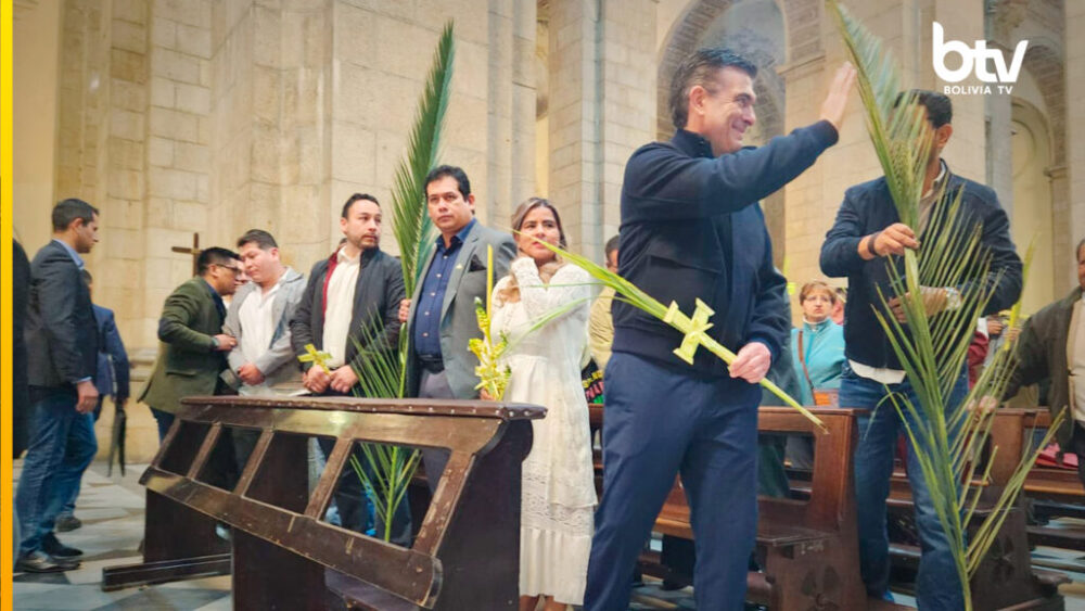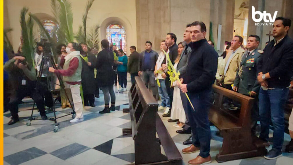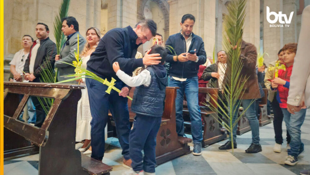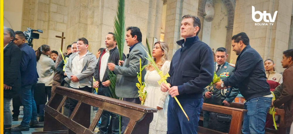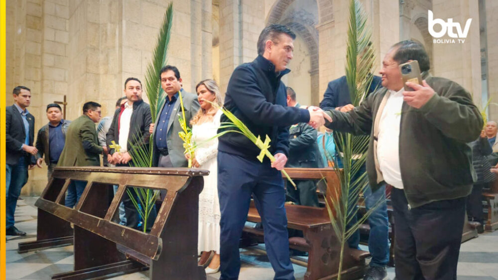 El presidente de Bolivia, Rodrigo Paz, participa este domingo en la misa de Domingo de Ramos en la Catedral Metropolitana de la plaza Murillo, presidida por el monseñor Percy Galván y acompañado por el padre Iván. La jornada cuenta con la participación de autoridades nacionales y cientos de fieles quienes se dieron cita para participar en los actos litúrgicos (FOTOS: BTV)