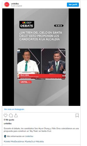 En el debate de candidatos a la Alcaldía de Santa Cruz de la Sierra, fueron doce candidatos los que se presentaron en dos bloques en un evento organizado por el Órgano Electoral Plurinacional y que fue transmitido en vivo por la red UNITEL.
