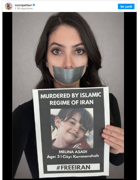 También subió una foto de Assal Shafei, de 21 años, que fue “asesinada por el régimen”. Junto con la imagen, replicó el último mensaje de Shafei, de enero: “Como una feminista radical, debo decir: larga vida al sha”.