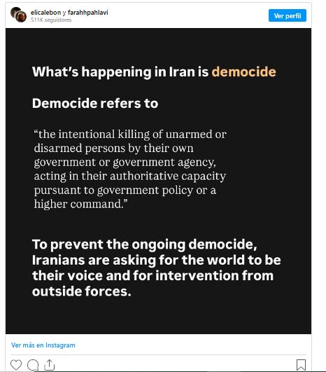 Pero no deja de lado las movilizaciones contra el régimen islámico iraní, y se expresa, en sus historias de Instagram, a favor de su padre, Reza, como heredero del trono.