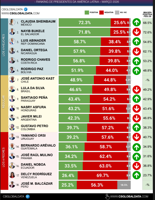 En comparación con febrero de 2026, el Presidente de Bolivia subió un puesto en este ranking, ya que se encontraba en el séptimo lugar con el 48,8% de imagen positiva.