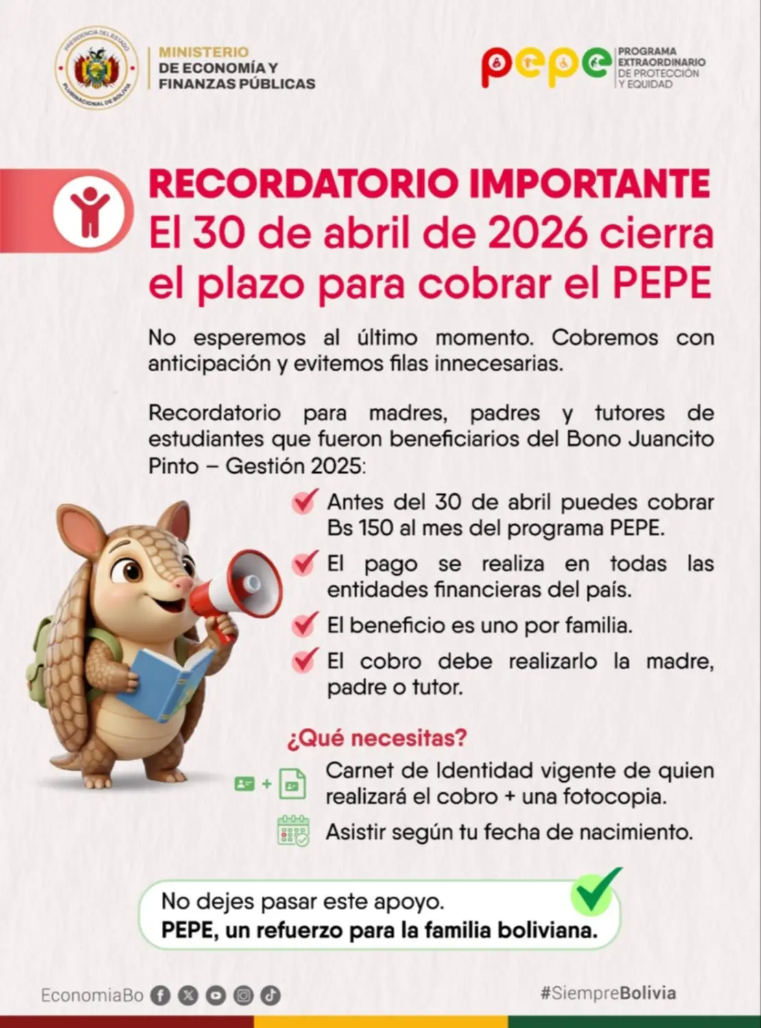 Las autoridades recomiendan revisar la vigencia de los documentos de identidad con antelación para evitar rechazos en ventanilla. Si el carnet se encuentra vencido, el beneficiario deberá renovarlo antes de la fecha límite del 30 de abril.