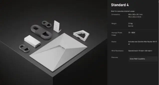 El paquete Standard 4 corresponde a la cuarta versión de la antena estándar de Starlink y está orientado a usuarios del plan residencial de 100 Mbps. Este incluye un Router Mini, un dispositivo compacto con tecnología Wi-Fi 6 de doble banda, pensado para hogares pequeños o con necesidades básicas de conectividad.