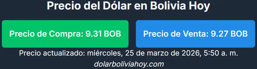 De acuerdo con el portal dolarboliviahoy.com, la divisa se ubica en Bs 9,31 para la compra y Bs 9,27 para la venta, lo que representa un leve incremento en la cotización de compra respecto a la jornada anterior.