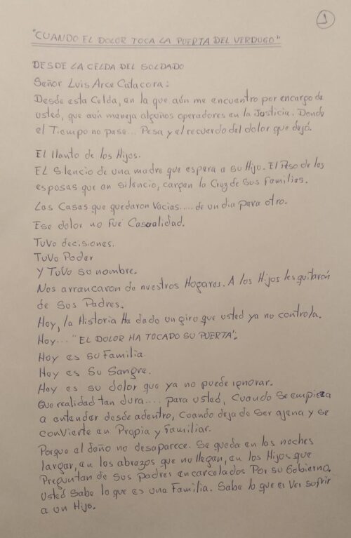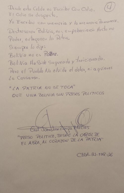 En el documento, titulado «Cuando el dolor toca la puerta del verdugo», Zúñiga sostiene que la situación judicial que ahora atraviesa la familia del exmandatario representa un giro en la historia. «Hoy el dolor ha tocado su puerta», señala, en referencia de manera directa al encarcelamiento de Arce Mosqueira, quien fue recluido en el penal de Palmasola, en Santa Cruz, por el lapso de 140 días.