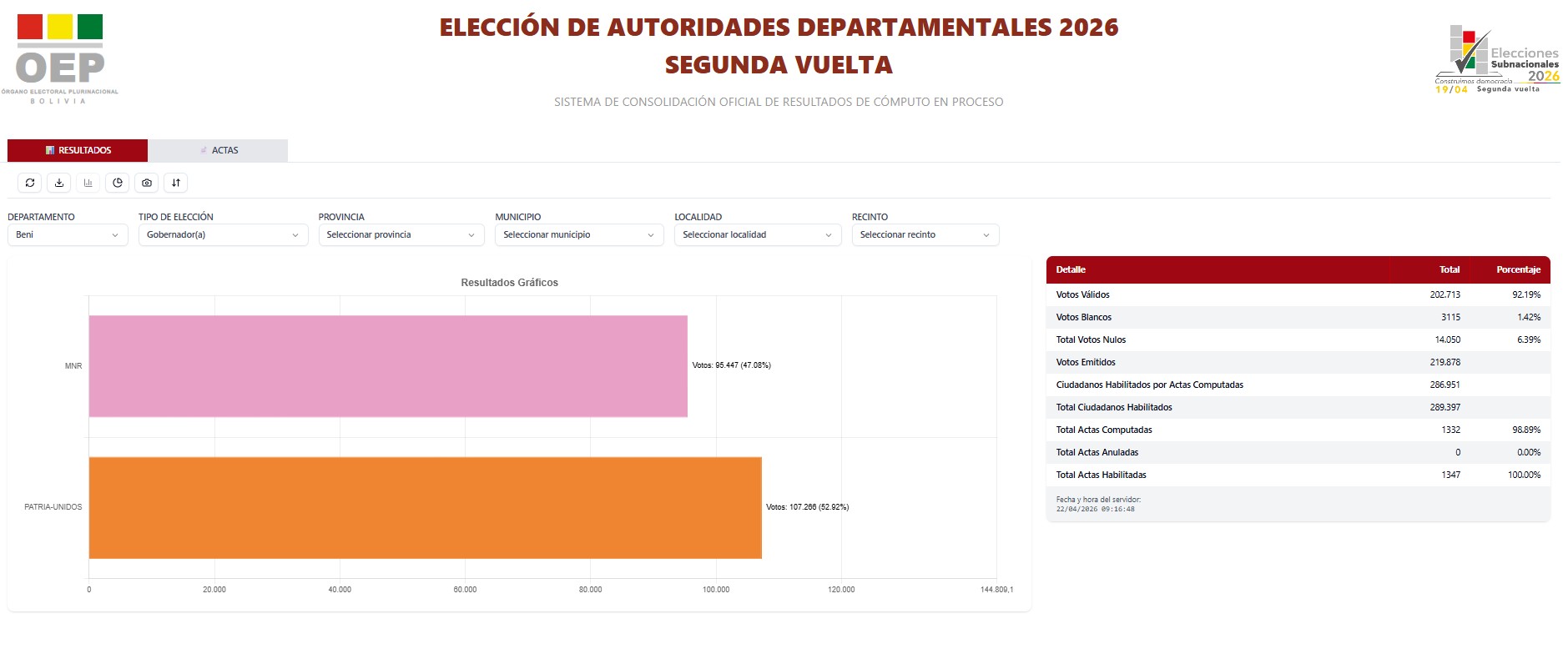 Agenda informativa: Beni está a quince actas de cerrar el cómputo oficial al límite