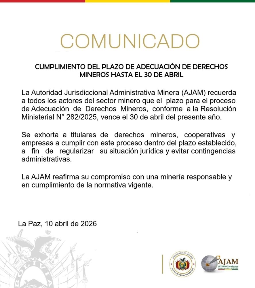 “Se exhorta a titulares de derechos mineros, cooperativas y empresas a cumplir con este proceso dentro del plazo establecido, a fin de regularizar su situación jurídica y evitar contingencias administrativas”, se lee en un comunicado de la Autoridad Jurisdiccional Administrativa Minera (AJAM)