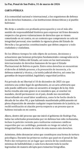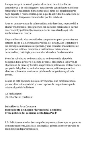 «Lo que se está haciendo no sólo es venganza, sino también excusa para ocultar la incapacidad y la corrupción de un gobierno que le miente al pueblo boliviano», concluye el manuscrito.