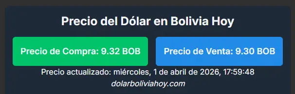 El portal dolarboliviahoy.com reflejó una caída gradual a lo largo del día. La jornada comenzó a las 06:00 con una cotización de Bs 9.36 para la compra y Bs 9.32 para la venta. Sin embargo, al cierre de la tarde, el precio se ajustó a Bs 9.32 para la compra y Bs 9.30 para la venta.