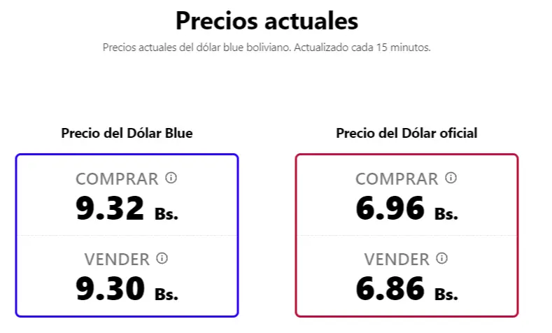 Por su parte, el sitio bolivianblue.net, que realiza actualizaciones cada 15 minutos, mostró un comportamiento similar. Tras haber iniciado el día en Bs 9.34 para la compra, cerró la jornada en Bs 9.32 para la compra y Bs 9.30 para la venta.