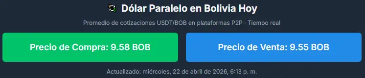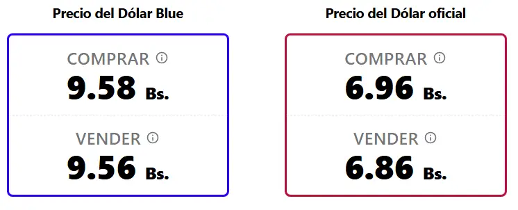 Por su parte, este portal reportó cifras ligeramente superiores al finalizar la tarde, con Bs 9,58 para la compra y Bs 9,56 para la venta. A mediodía, estaba en Bs 6,00 para la compra y Bs 9,51 para la venta. A las seis de la mañana estaba en Bs 9,53 para la compra y Bs 9,51 para la venta.