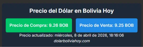Dolarboliviahoy.com: La moneda inició el día con una cotización de Bs 9.30 para la compra, pero tras un ajuste al mediodía, cerró la jornada en Bs 9.26 para la compra y Bs 9.25 para la venta.