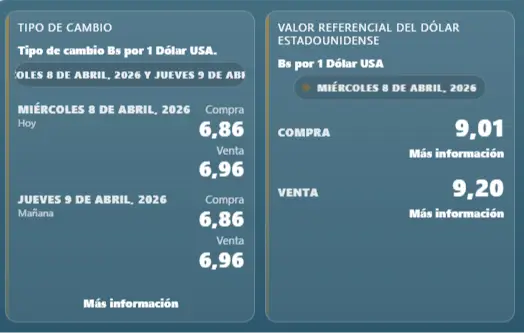El ente emisor también registró movimientos en sus valores referenciales operativos para las entidades financieras del país. Para este miércoles, la compra oficial se situó en Bs 9.01, subiendo un centavo respecto a los Bs 9.00 de ayer. De igual forma, la venta oficial se estableció en Bs 9.20, superando los Bs 9.19 de la jornada anterior.
