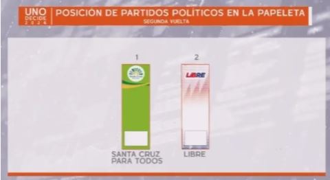 El Tribunal Electoral Departamental de Santa Cruz (TED) realizó este martes el sorteo de ubicación de la franja y aprobó el diseño de la papeleta de sufragio para la segunda vuelta a la Gobernación cruceña, prevista para el domingo 19 de abril.