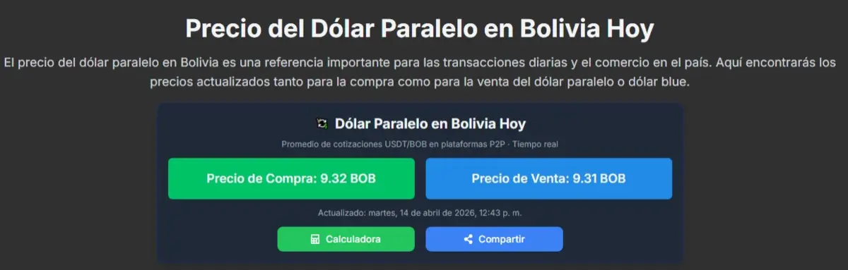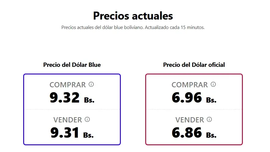 De acuerdo con datos del portal especializado dolarboliviahoy.com, a las 12:43 la moneda norteamericana se cotizaba en Bs 9,32 para la compra y Bs 9,31 para la venta, lo que refleja un ligero ajuste respecto a los valores de las primeras horas del día, cuando se situaba en Bs 9,33 para la compra y Bs 9,30 para la venta.