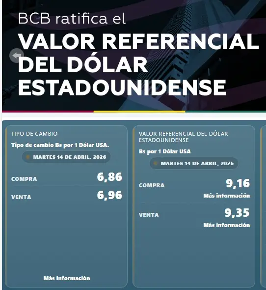 Por su parte, el tipo de cambio referencial publicado por el BCB para esta jornada se ubica en Bs 9,16 para la compra y Bs 9,35 para la venta, valores utilizados principalmente en operaciones internacionales y sujetos a variaciones diarias.