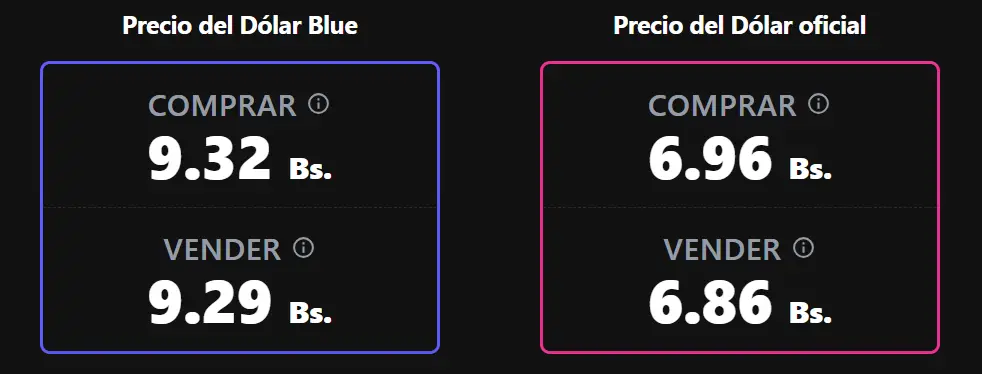 Por su parte, este portal muestra una caída en ambas bandas, cotizando hoy la compra en Bs. 9,32 y la venta en Bs. 9,29 por unidad. Al contrastar con ayer, se evidencia que la compra bajó un centavo desde los Bs. 9,33 y la venta retrocedió dos centavos desde los Bs. 9,31 previos en este monitor digital.
