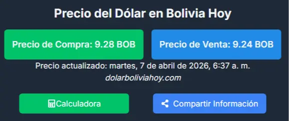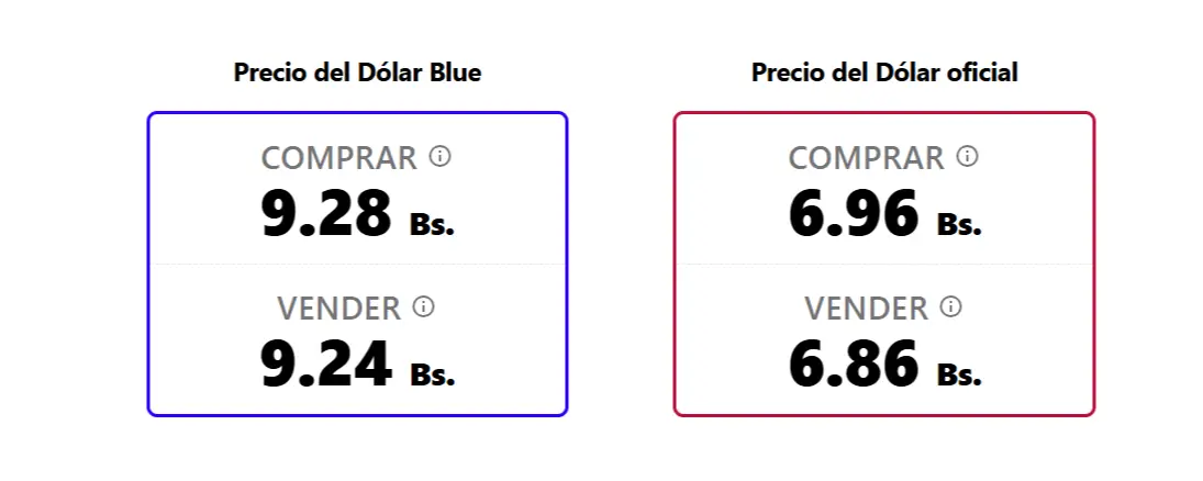 Por su parte, la web bolivianblue.net, que actualiza datos cada 15 minutos, reporta los mismos valores para este martes: Bs 9,28 (compra) y Bs 9,24 (venta).