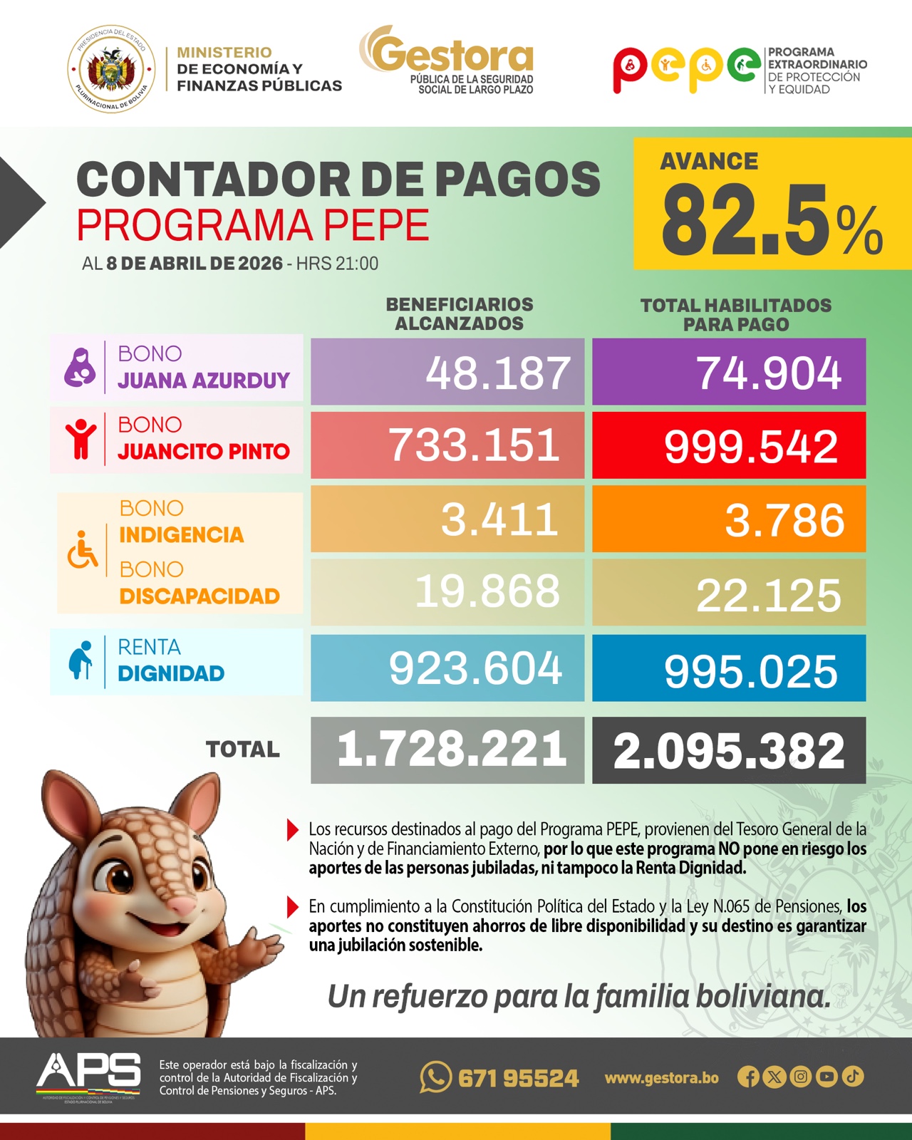 De acuerdo con los datos de la Gestora, hasta el miércoles 8 de abril, el Bono Pepe llegó a 48.187 personas que reciben el Bono Juana Azurduy; 733.151 personas que captan el Bono Juancito Pinto: 3.411 personas que acceden al Bono Indigencia; 19.868 personas que tienen el Bono de Discapacidad y 923.604 personas que cobran la Renta Dignidad.