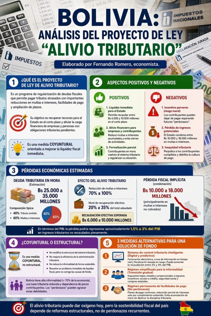 El problema estructural de Bolivia sigue siendo una alta informalidad (cercana al 80%), una base tributaria reducida y una fuerte dependencia de pocos contribuyentes. Este tipo de medidas no corrige esas debilidades, sino que puede agravarlas al generar expectativas de futuras amnistías. Por eso, aunque útil en el corto plazo, el alivio tributario no contribuye a una reforma integral del sistema impositivo ni a mejorar la sostenibilidad fiscal del país.