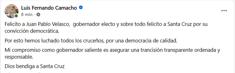 El gobernador saliente, Luis Fernando Camacho, reconoció el triunfo de Juan Pablo Velasco y destacó la madurez democrática de los cruceños.