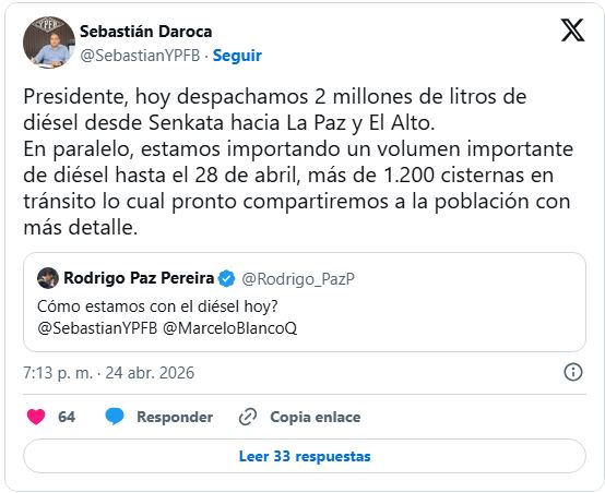 Por su parte, el presidente de YPFB, Sebastián, Daroca informó que durante la jornada se despacharon 2 millones de litros de diésel desde Senkata hacia La Paz y El Alto, así como reportó que se está importando un volumen importante de combustible hasta el 28 de abril, con más de 1.200 cisternas en tránsito.