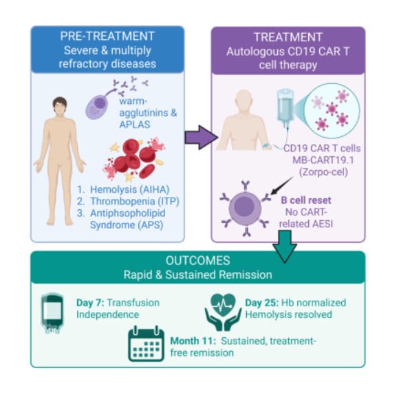 La anemia hemolítica autoinmune (AIHA), la trombocitopenia inmune (ITP) y el síndrome antifosfolipídico (SAF) son enfermedades autoinmunes mediadas por células B y definidas por autoanticuerpos patogénicos. Las células CAR-T dirigidas contra CD19 han demostrado recientemente la capacidad de reiniciar las células B desreguladas e inducir remisiones duraderas en enfermedades autoinmunes sistémicas refractarias. Sin embargo, la evidencia de eficacia en la AIHA grave refractaria al tratamiento es limitada.