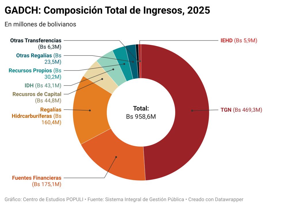 Del 36,5% restante de ingresos del departamento –Bs 269,3 millones de libre disponibilidad–, la mayor parte son regalías hidrocarburíferas, mineras, Impuesto Directo a los Hidrocarburos (IDH) e Impuesto Especial a los Hidrocarburos (IEHD); ninguna es ingreso autónomo departamental, hace notar Populi.